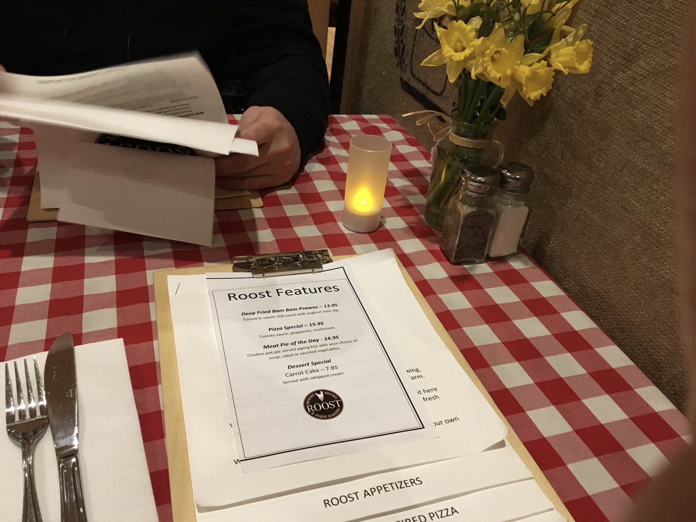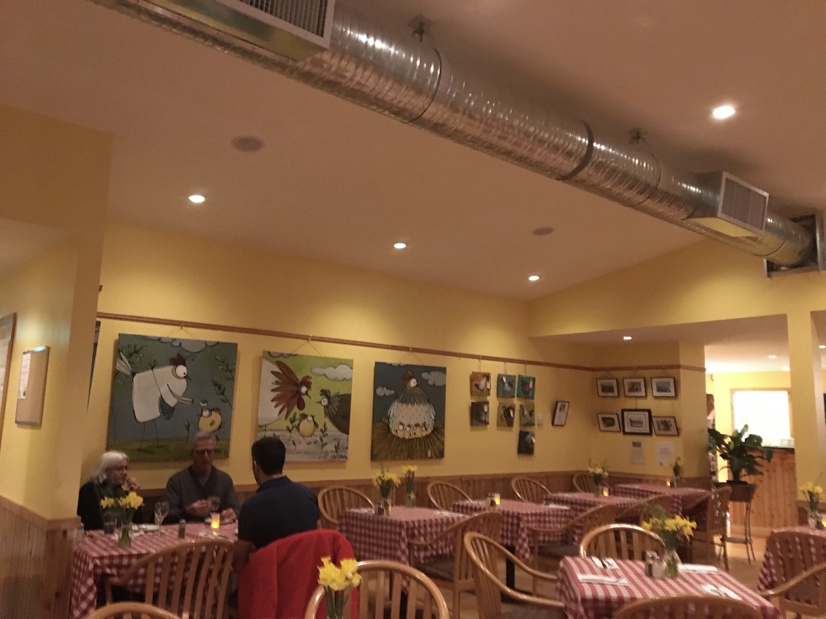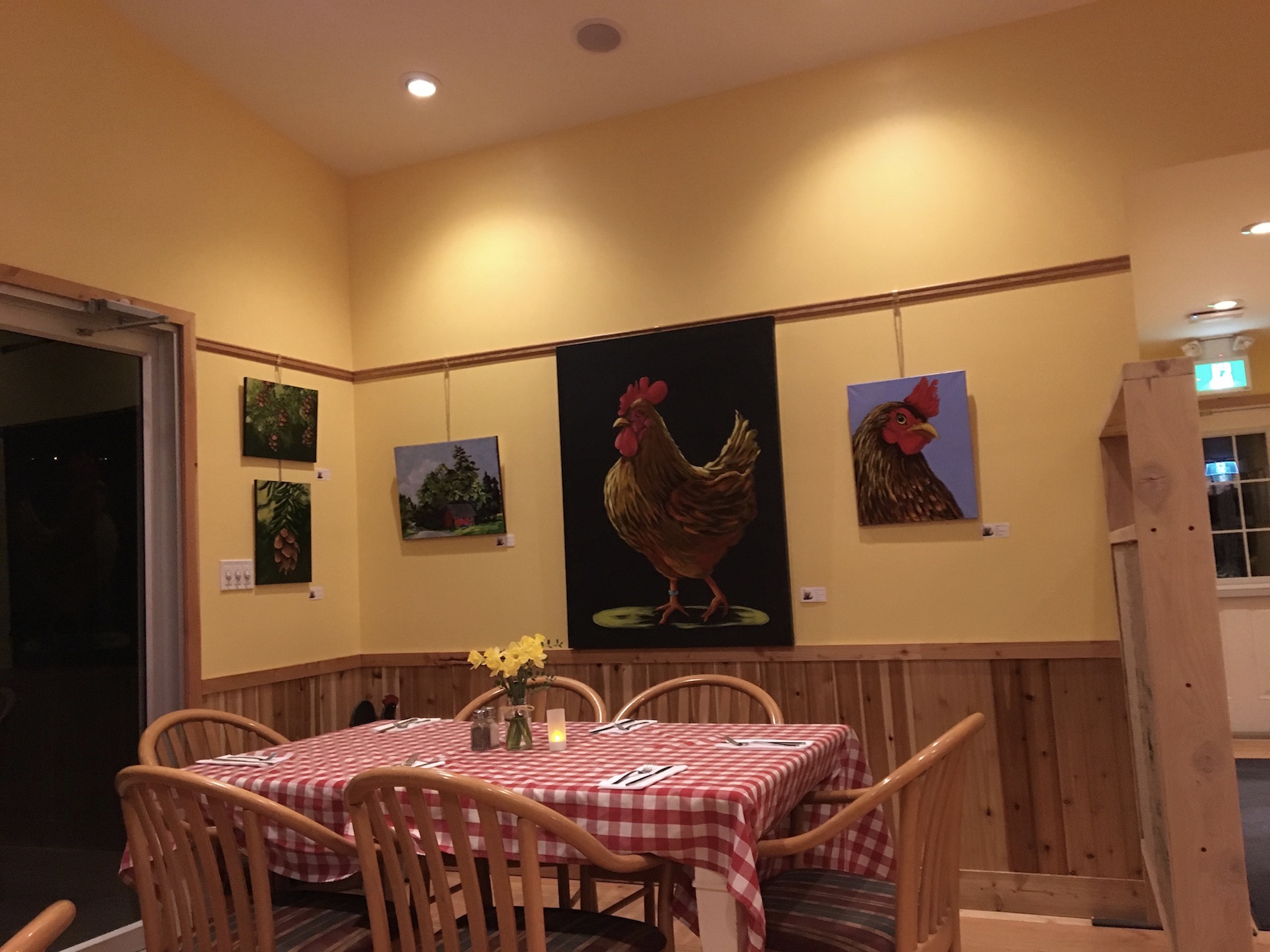 When you walk in, it’s enormous and cosy all at once. Yes, a barn can be cosy. Red checked table cloths, mason jar vases, and poultry-themed artwork displayed everywhere. You won’t run afowl. Ha. Sorry.