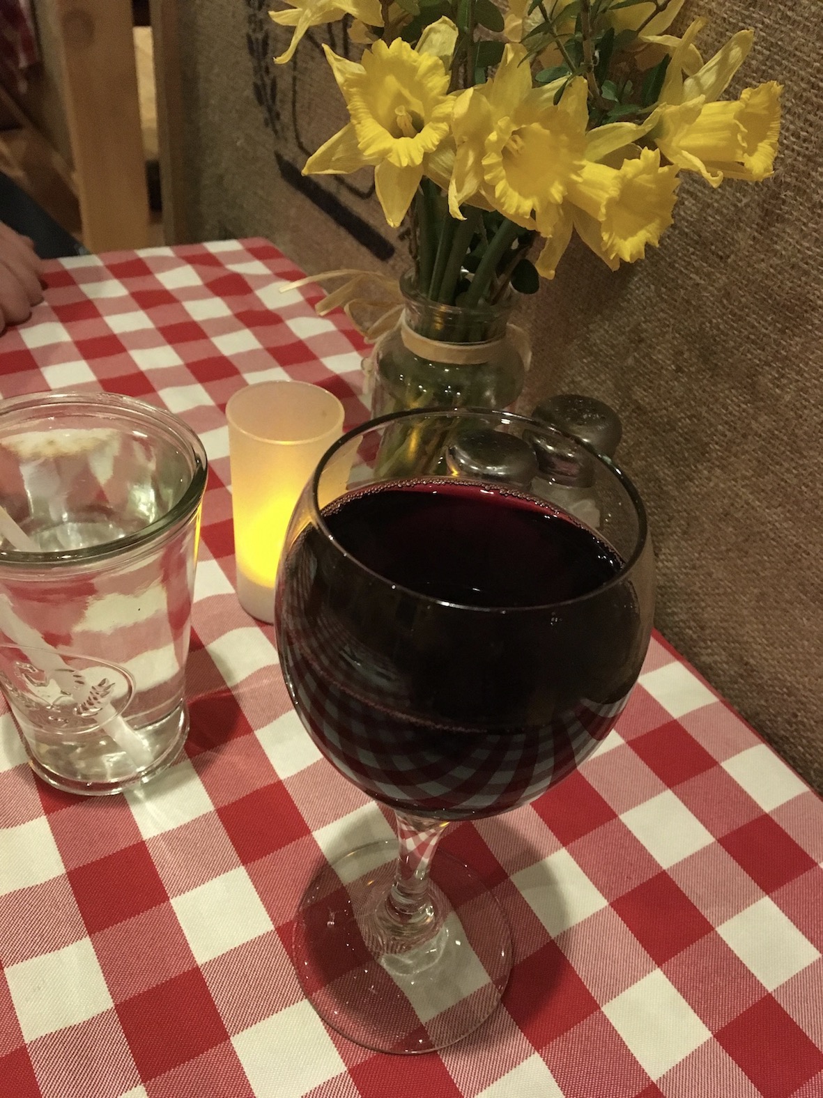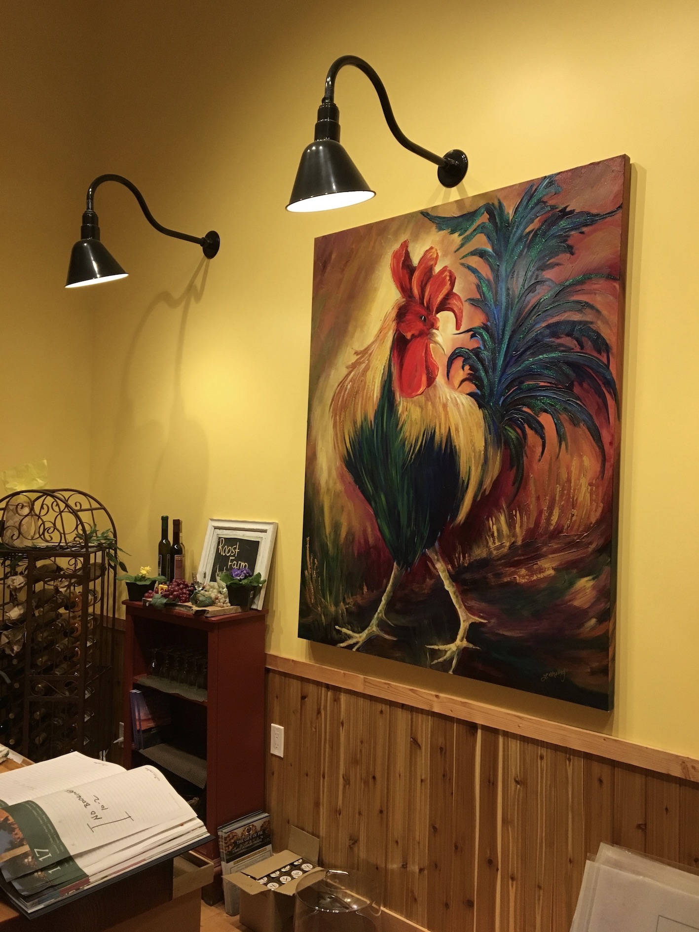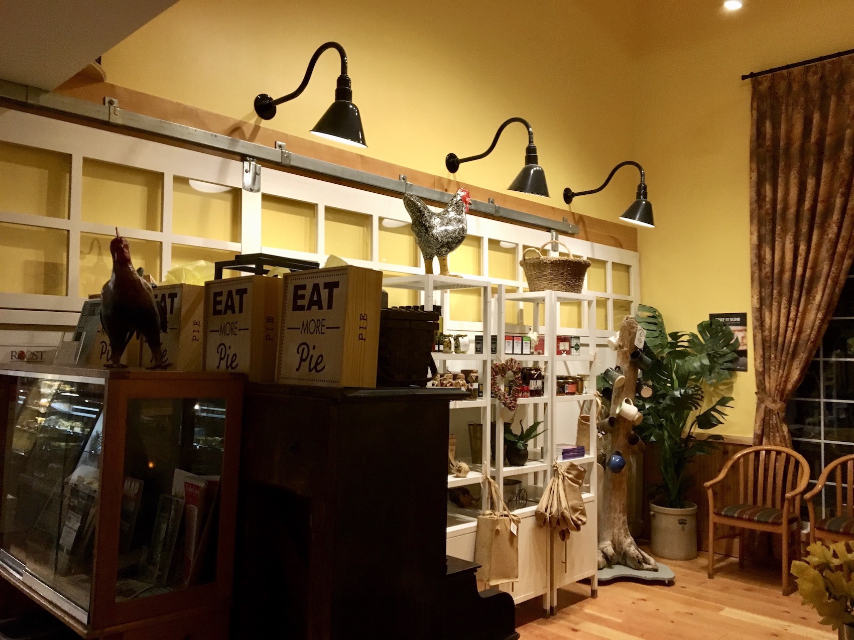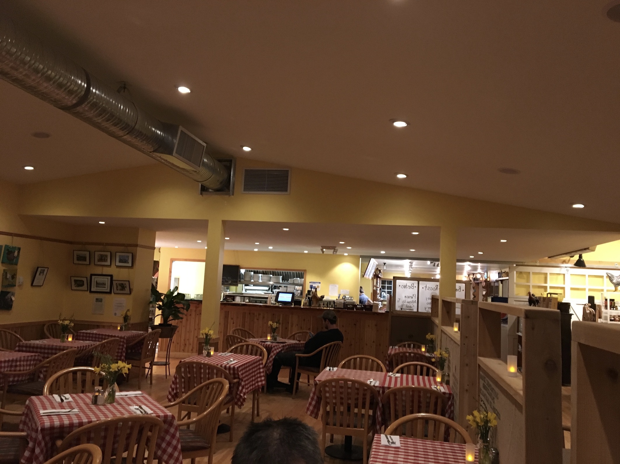 When you walk in, it’s enormous and cosy all at once. Yes, a barn can be cosy. Red checked table cloths, mason jar vases, and poultry-themed artwork displayed everywhere. You won’t run afowl. Ha. Sorry.