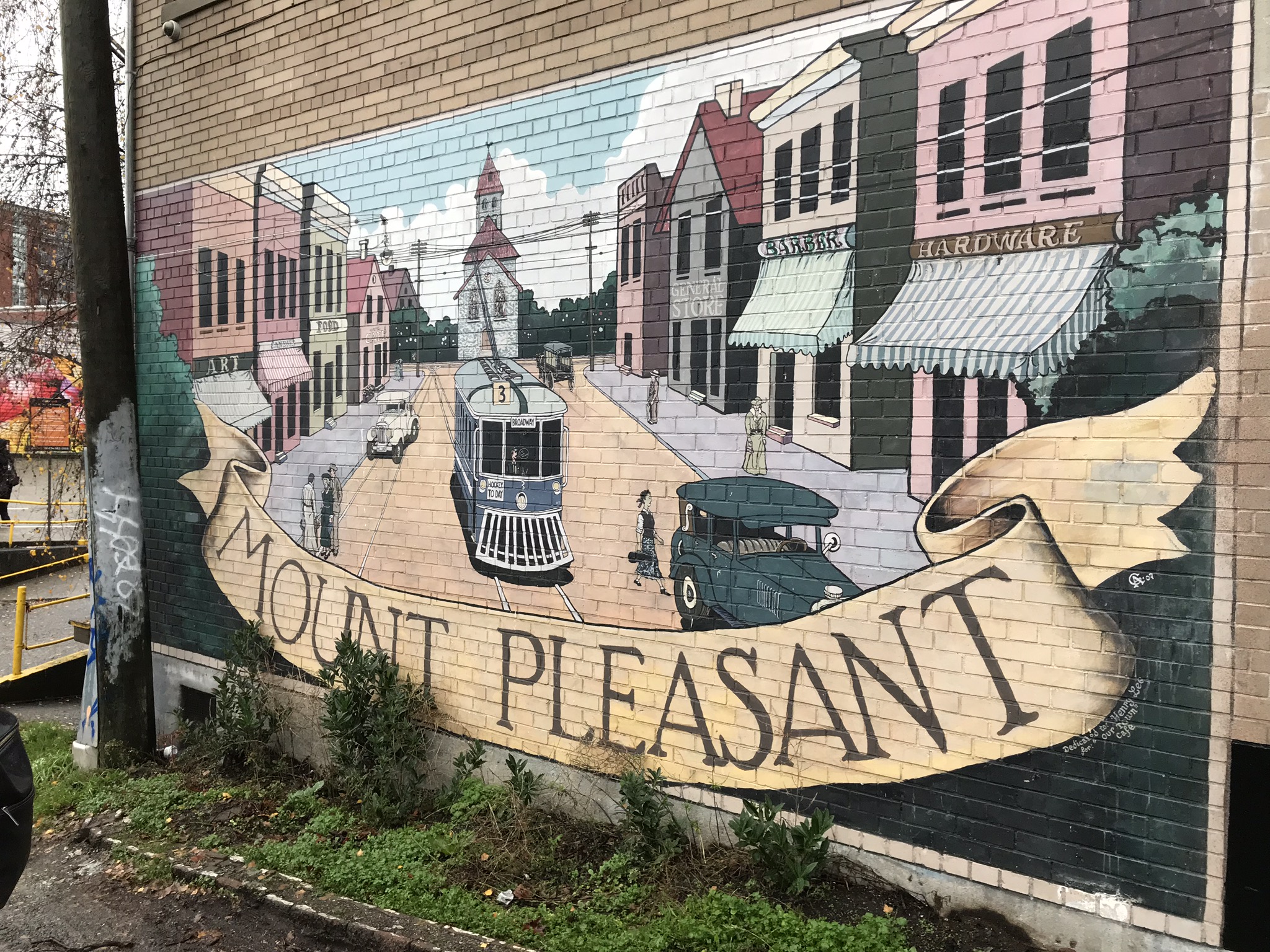 As the pilot tourists for this LUQL two -hour experience, it was just us and the very knowledgeable and cheerful Tasnim; so we clocked through quite quickly. Probably because my phone battery dropped to 10% partway through the tour – NOOOOOO…… – and while the Brit took over photo duty with his phone, he takes pictures slightly more efficiently than I do… Ha. It actually made me be more present in what we were doing, but I digress. Because we finished the scheduled portion early, Taz led us further up Main Street and its side streets where we found my second favourite mural – Emily Gray’s ‘Cycle Mural’ on Main and 10th. Think you can guess why? 😉