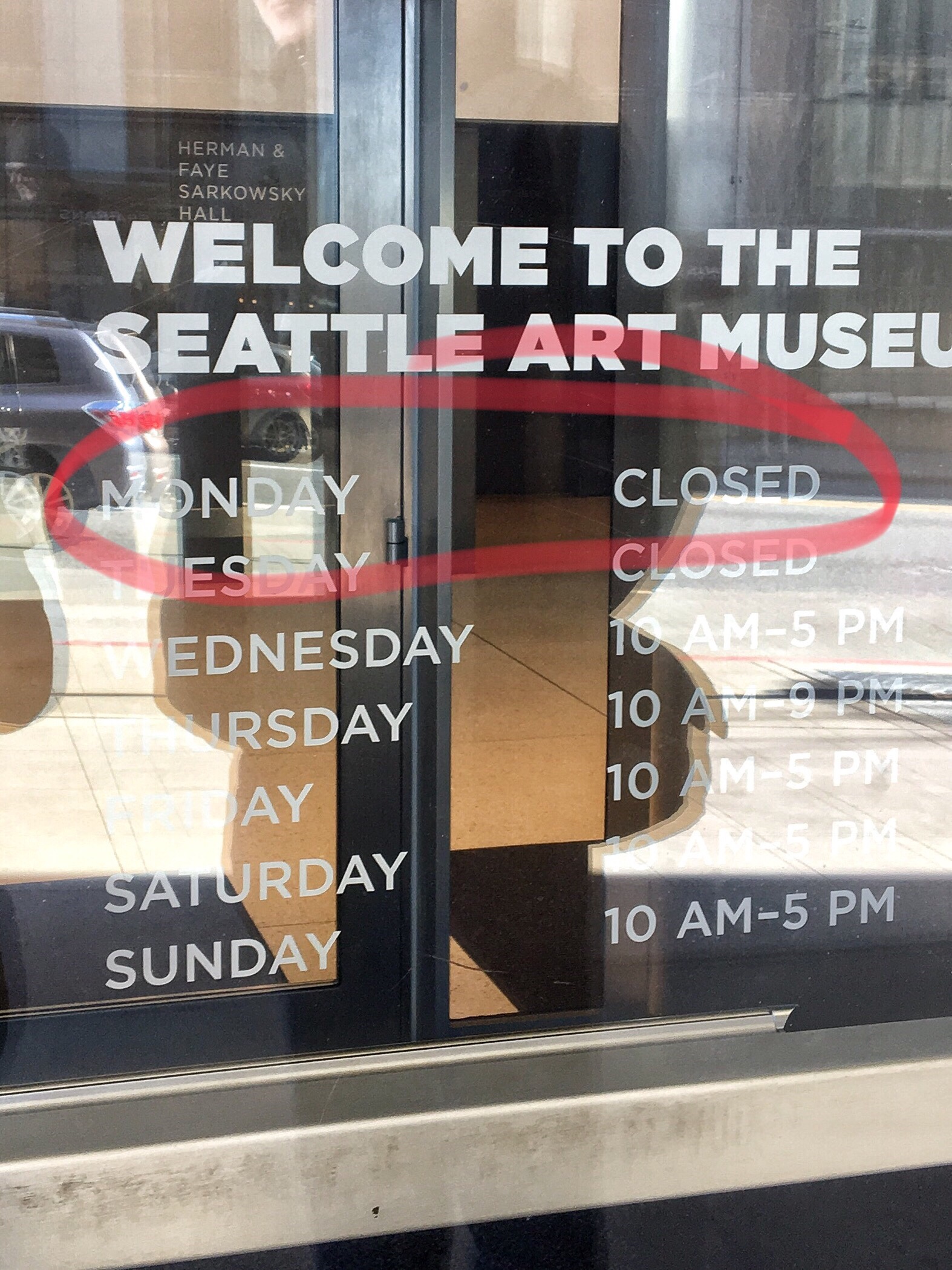 Known as SAM to locals, full disclosure that I am listing the main buidling solely based on the excellent TripAdvisor reviews, and the fact that Dorjon at the Belltown Inn very highly recommended it. Why? Because we never actually got to go in! Google Maps had the hours listing Monday as open, but alas, the app was very wrong. So this one goes back on the list for next time.